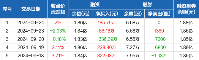 融资融券信息显示,2024年9月24日融资净买入185.79万元;融资余额1.86亿元,较前一日增加1.01%。