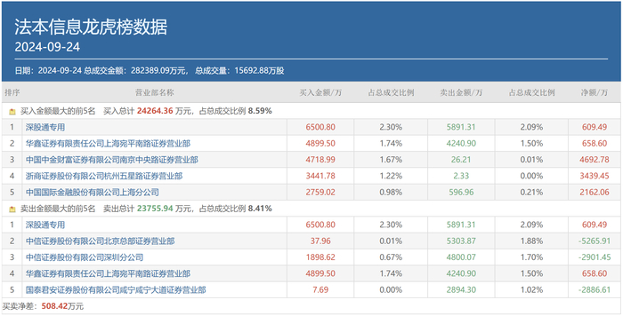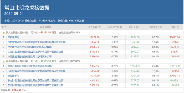 常山北明(000158.SZ)9月24日龙虎榜买卖双方前五位中也都有呼家楼的常用席位现身,其中,中信建投证券北京东城分公司位列买方第三位,买入金额为6926.74万元,卖出金额为3847.27万元;中信证券北京总部则位列卖方榜首,卖出金额为1.78亿元,同时买入5324.15万元。上述两个席位当日合计的净卖出金额为9436.48万元。