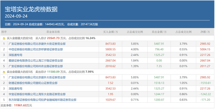 事实上,9月20日广发证券北京建外大街就曾出现在宝塔实业3日龙虎榜买方榜首,买入金额为6884.92万元,卖出金额为8332.31万元;9月23日上述席位又在买入该股4366.02万元的同时卖出3032.72万元。