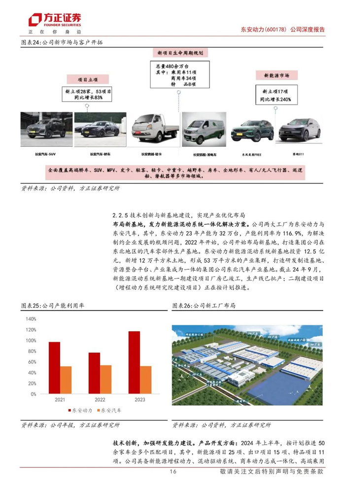 新能源汽车兴起,多领域客户全覆盖。公司新能源产品的新定点客户较多,按照客户的产品上市计划,2025年下半年到2026年初,将有规模较大的增程式量产车型上市。新开拓市场项目生命周期规划销量达480万台,其中新能源市场项目生命周期规划销量达310万台。积极开拓市场,多领域客户全覆盖。2024年上半年公司新项目生命周期规划480万台,其中包括乘用车11项,商用车34项,特种产品8项,主要客户包括长安跨越以及长安凯程。项目立项共有28家,包含53个项目,同比增长83%,主要客户包括长安汽车SUV以及轿车。新能源市场新立项17项,同比增加240%,当前主要客户包括东风岚图Free、合众汽车、零跑汽车等。
