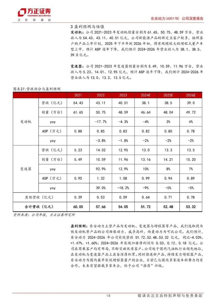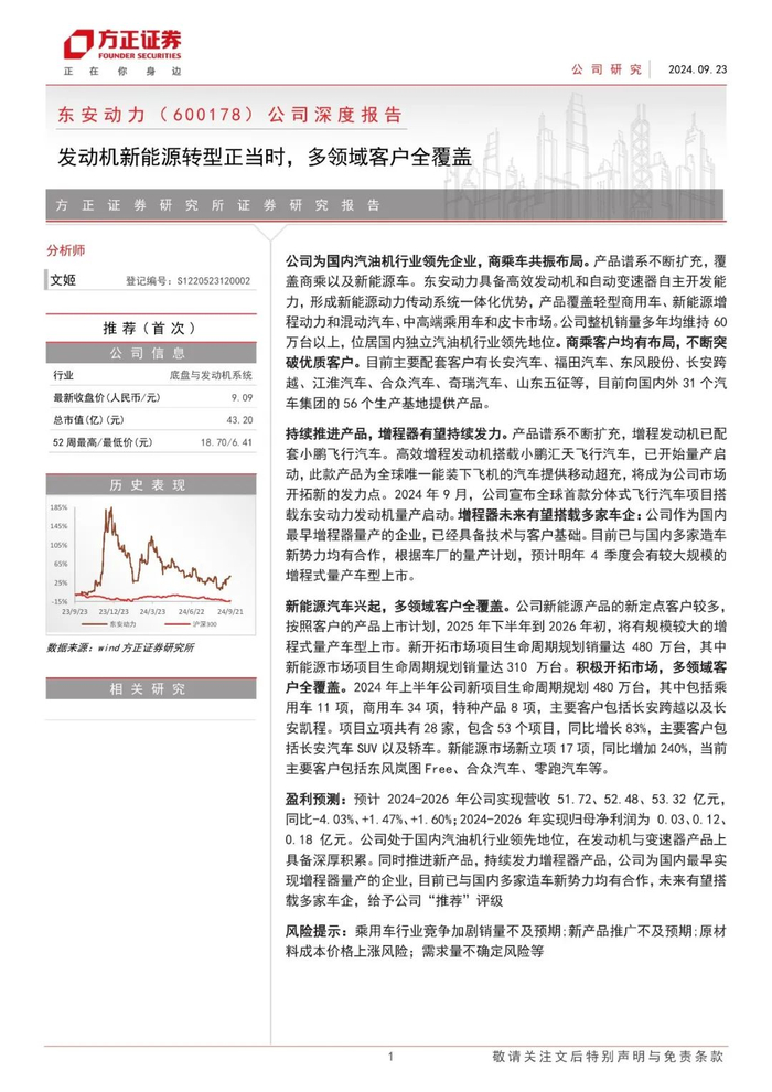 盈利预测:预计2024-2026年公司实现营收51.72、52.48、53.32亿元,同比-4.03%、+1.47%、+1.60%;2024-2026年实现归母净利润为0.03、0.12、0.18亿元。公司处于国内汽油机行业领先地位,在发动机与变速器产品上具备深厚积累。同时推进新产品,持续发力增程器产品,公司为国内最早实现增程器量产的企业,目前已与国内多家造车新势力均有合作,未来有望搭载多家车企,给予公司“推荐”评级