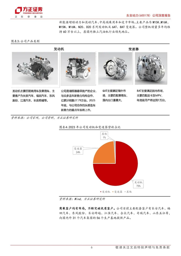 公司为国内汽油机行业领先企业,商乘车共振布局。产品谱系不断扩充,覆盖商乘以及新能源车。东安动力具备高效发动机和自动变速器自主开发能力,形成新能源动力传动系统一体化优势,产品覆盖轻型商用车、新能源增程动力和混动汽车、中高端乘用车和皮卡市场。公司整机销量多年均维持60万台以上,位居国内独立汽油机行业领先地位。商乘客户均有布局,不断突破优质客户。目前主要配套客户有长安汽车、福田汽车、东风股份、长安跨越、江淮汽车、合众汽车、奇瑞汽车、山东五征等,目前向国内外31个汽车集团的56个生产基地提供产品。