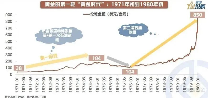 第一轮“黄金”时代是1971年初到1980年初,伦敦金现从38美元涨到850美元,涨幅近21倍。支撑这轮金价走牛的核心源头是两次石油危机导致的顽固高通胀。