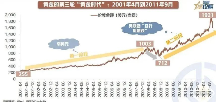 第三轮“黄金”时代是2001年4月到2011年9月,伦敦金现从255美元涨到1921美元,涨幅超6倍,上涨的核心驱动是弱美元叠加美联储“大放水”。