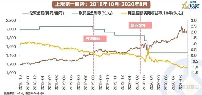爆发上涨第一阶段是2018年10月-2020年8月,伦敦金现从1183美元涨到2075美元,涨幅75%,这个阶段的核心驱动力是美联储降息。自2008年金融危机后,美国经济经历了十多年的超长扩张,进入2019年后,美国经济开始显现疲态,制造业PMI持续下行,美联储于下半年拉开了降息的帷幕,叠加2020年初新冠疫情爆发,美联储不得不紧急降息扩表,实际利率的一路下行,带动了黄金价格飙升。