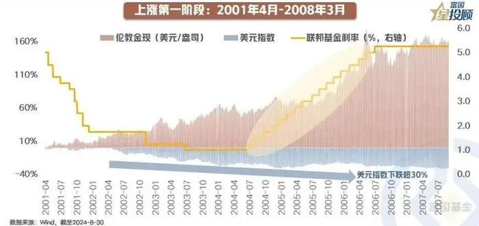 爆发上涨第一阶段是2001年4月到2008年3月,伦敦金现从255美元涨到1003美元,涨幅超1.6倍,这个阶段的核心驱动是美元的弱势。2000年互联网泡沫破裂和9.11恐怖袭击先后发生,对美国经济造成沉重的打击。为了降低恐慌、提振经济,美联储于2001年1月开始大幅降息,黄金价格随之大涨。此外,欧元的引入对美元信用体系也造成了巨大挑战。2002年7月,欧元成为欧元区唯一的合法货币,冲击了美元作为全球货币的中心地位,也刺激了黄金价格的上涨。值得注意的是,虽然2004年6月到2006年7月美国走向加息周期,但依然没有挡住黄金上涨的步伐。核心原因在于:相对欧元区经济的逐渐走强,美国经济却不断走弱,导致美元较为弱势。整体来看,这一阶段美元指数下跌超过30%,而黄金正是美元的镜像。