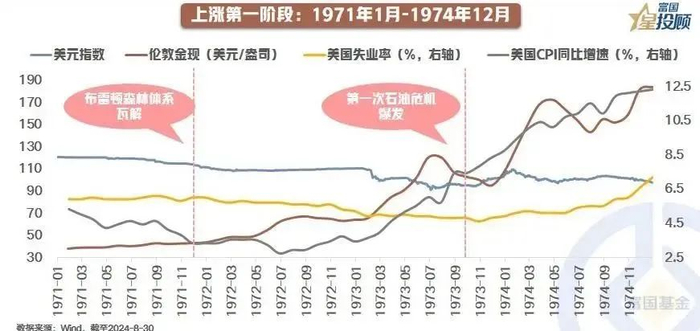 爆发上涨第一阶段是1971年1月-1974年12月,伦敦金现从38美元涨到185美元,涨幅超3倍,核心驱动是布雷顿森林体系瓦解和第一次石油危机。二战结束后,美国经历了近20年的战后繁荣期。然而自上世纪60年代中期开始,战胜国的政治红利大幅消退,叠加朝鲜、越南战争的持续消耗,美国的财政赤字显著增加,贸易逆差不断扩大,导致美元出现了“信任危机”。1971年12月,布雷顿森林体系瓦解,美元与黄金脱钩,并出现大幅贬值,金价也随之大涨。1973年10月,第一次石油危机爆发,进一步冲击美国经济,失业率和通胀的高企让美国陷入深深的滞胀,黄金价格再度冲高。