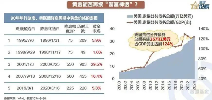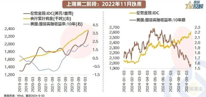 爆发上涨第二阶段是2022年11月以来,伦敦金现从1616美元涨到2640美元,涨幅63%,这个阶段的核心驱动力是央行增持叠加降息预期升温。2022年11月到2024年6月,黄金价格与美债实际利率出现了明显的背离。其背后的原因是,利率高企导致美国债务螺旋攀升,市场对其债务风险关注升温,开始交易美元信用贬值。在此背景下,出于规避信用货币风险、储备资产多元化等考虑,全球央行自2022年Q2以来加快购金节奏,累计净购金量超过2500吨,成为全球购买黄金的主力军,助推了黄金价格中枢的上移。但随着7月后降息预期的升温,黄金又和美债实际利率成了一根绳上的蚂蚱,回归负相关路径。