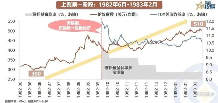 爆发上涨第一阶段是1982年6月-1983年2月,伦敦金现从300美元上涨到510美元,涨幅70%,这个阶段的核心驱动力是双底衰退后的联储连续降息。虽然沃尔克的的紧缩政策成功抑制了通胀,但却是以经济的双底衰退为惨痛代价,1982年的美国制造业PMI均值仅38,失业率均值高达9.7%。1982年7月后,美联储的工作重心从对抗通胀转向提振经济,联邦基金利率多次调降,10年期美债收益率快速下行454个BP,黄金价格也乘风而上。
