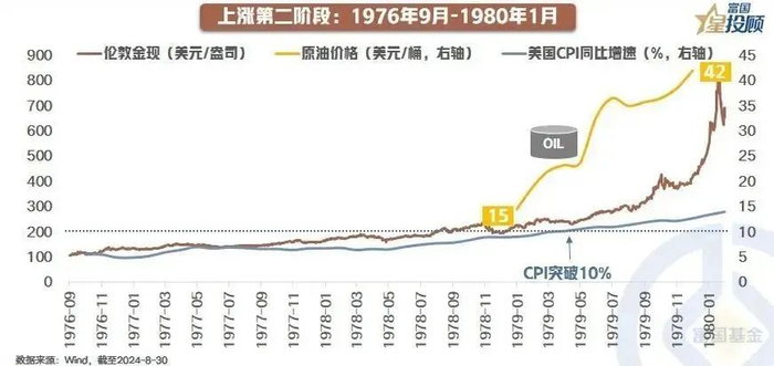 爆发上涨第二阶段是1976年9月-1980年1月,伦敦金现从104美元涨到850美元,涨幅超7倍,这个阶段的核心驱动是第二次石油危机。上世纪70年代中期后,美国经济加速回落,货币政策趋于宽松,物价加速上涨,美元继续贬值,金价不断抬升,但整体节奏较为丝滑。直到第二次石油危机爆发,金价进入加速上行通道,一句话总结,就是“通胀猛于虎,黄金贵如油。”1979年前后,伊朗爆发革命,社会和经济陷入动荡,演变成第二次石油危机,一桶油的价格从1978年底的15美元涨到1979年底的42美元,美国CPI同比增速也突破10%,一路走高。实际上,沃尔克上台后就立马出重拳采取了激进的紧缩货币政策,但狂奔的通胀野马直到1980年4月才拐头向下。