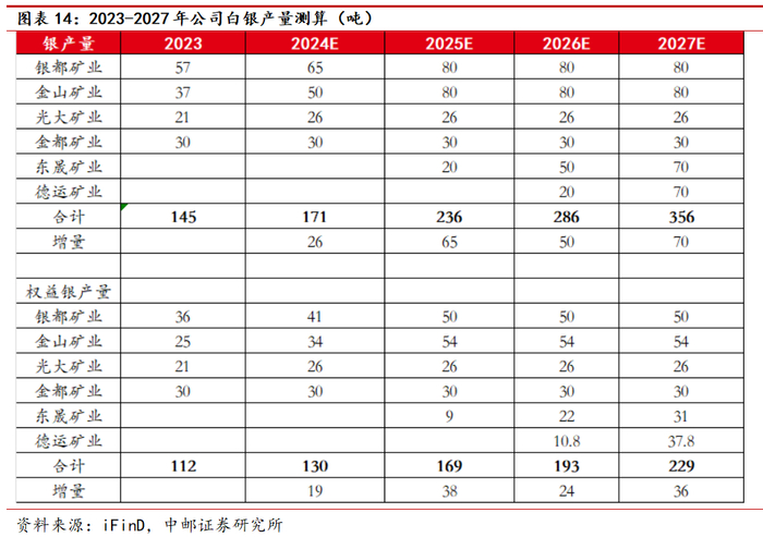 我们预计随着公司银都矿业北部矿区取得采矿权证、金山矿业技改完成、东晟矿业、德运矿业建成投产,公司2024-2026年白银年产量将达171/236/286吨,权益银产量达130/169/193吨,2027年德运矿业建成爬产后,公司银产量有望突破350吨,权益银产量有望达到229吨。