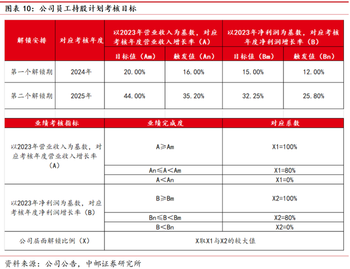 2024年考核营收/归母净利润同比增速不低于20%/15%,2025年考核营收/归母净利润较2023年增速不低于44%/32.25%。根据公司员工持股计划草案,2024年公司营收较2023年同比增长大于20%,或归母净利润(剔除股权激励、员工持股计划涉及费用)较2023年同比增长大于15%,公司层面可全部解锁第一批股权份额,2025年公司营收较2023年同比增长大于44%,或归母净利润(剔除股权激励、员工持股计划涉及费用)较2023年同比增长大于32.25%,公司层面可全部解锁第二批股权份额。