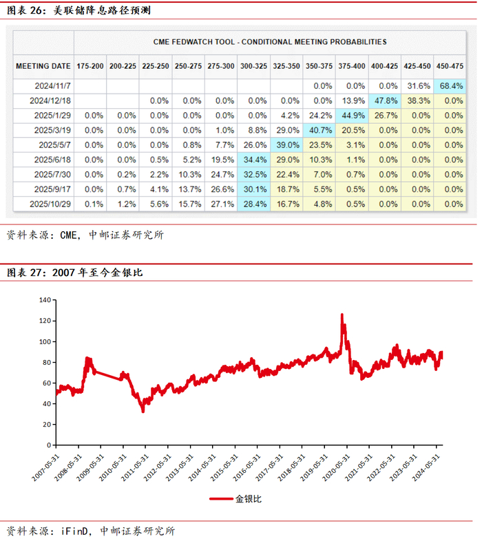 美联储开启降息周期,金银比亟待修复。供需方面,我们预计2024-2026年,白银总供给维持在2%增幅。需求方面,光伏用银带动工业需求稳步增长,银饰需求或受高银价压制,实物投资需求维持2%增速;预计总需求2024-2026年增幅为2%/4%/3%,白银供应缺口日益扩大。宏观方面,美联储正式开始降息周期,9月18日降息50个基点,24/25年预期还将降息50/100个基点,贵金属投资价值凸显,此外美国经济数据虽然走弱,但尚未证实衰退,此次降息为预防式降息,白银价格前期受经济衰退预期影响大幅调整,带动金银比回升至83左右高位,预计四季度市场将逐步修复对美国经济衰退预期,银价存在反弹需求。长期看,白银作为贵金属,地缘冲突带来更大的投资避险需求,光伏需求作为全球能源转型的主要抓手之一将保持较高增速,白银价格中枢持续上移。