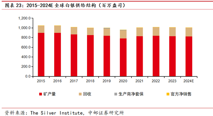 历史看白银供应量基本保持稳定并小幅波动。近9年来,全球白银供应量均值为9093.9Moz/年,并保持相对稳定。其中,2020年及2021年分别受公共事件影响停工和复产,矿产银供应量波动较大。2023年全球白银供应量为1010.7 Moz(百万盎司),与2022年小幅下滑0.46%。其中,矿产银与回收银几乎占据了全部供应,2023年分别贡献830.5 Moz及178.6Moz,占比82.17%/17.67%,占比相对稳定。2024年,全球白银供应量预计为1003.8Moz,预计小幅下滑0.68%。