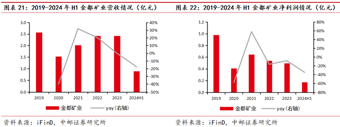 金都矿业历史经营业绩较为稳定,2021-2023年分别实现营收2.02/2.42/2.42亿元,实现净利润0.65/0.54/0.50亿元。2024年H1由于部分产品销售策略影响,实现营收/净利0.89/0.17亿元,同比减少17.60%/34.89%。