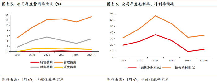 毛利率和净利率在2021年达到67.01%/36.62%,后由于银价下滑和成本提升等原因下滑,2023年分别为31.96%/9.04%,2024年H1分别为35.28%/12.53%。