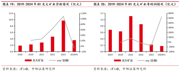 2023年产量及品位下滑拖累业绩。2023年光大矿业实现营收9.73亿元,同比增长108%,主要由于下属子公司天津兴盛金属材料有限公司贸易业务收入增幅较大,实现净利润0.22亿元,同比下滑74%,主要由于开采矿段白银品位及产量下降。2024年上半年品位略有恢复,盈利0.17亿元,同比增长526.48%。
