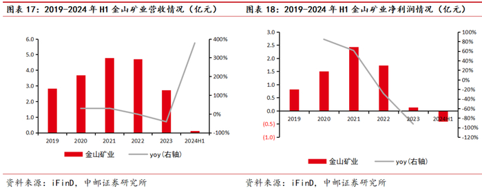 从过往业绩看,金山矿业2019-2021年逐步爬产,分别实现净利润0.82/1.51/2.43亿元,2022年实现净利润1.73亿元,2023年因技改影响产量,仅实现净利润0.13亿元,2024年上半年亏损0.41亿元。