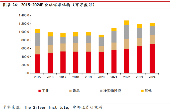 2023年饰品、实物投资需求放缓,工业需求依旧景气。需求方面,继2021年的强劲反弹之后,2022年全球白银需求量又出现了显著增长,为1278.9Moz(百万盎司),同比增长16.31%,达到2015年以来的最高水平,饰品是主要推动力,同比增长28.85%。2023年总需求量回落6.56%,饰品、实物投资同比减少13.39%/27.88%,工业需求同比增加11.24%。