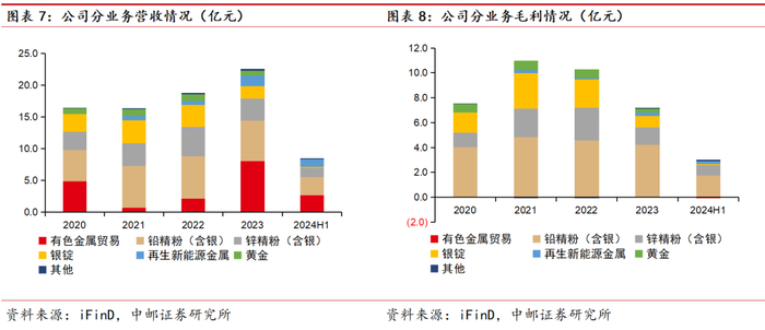 2024年上半年销量下滑,或于下半年加快进度。2024年上半年受天气寒冷、金山技改等因素影响,铅/锌/银产量同比-6.92%/-23.14%/+12.51%,公司预期下半年银价上涨以及库存减少影响,铅/锌/银销量同比下滑25.90%/34.73%/15.35%。预计下半年公司将加快推进技改,调整销售策略,保证全年目标实现。