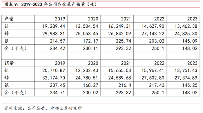 公共事件及金山技改导致银产量波动。根据公司公告,2019-2023年公司铅锌银金四大金属产量呈现震荡走势,2019年公司白银产量达215吨,主要系2018年底金山矿业并表带来产量提升,2020年受公共事件影响产量有所下滑,随后在2021年恢复正常,2023年由于金山矿业技改,银产量下滑至145吨。