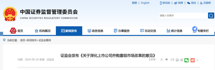 2024-09-24证监会发布《关于深化上市公司并购重组市场改革的意见》