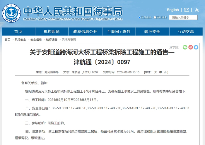 关于安阳道跨海河大桥工程桥梁拆除工程施工的通告—津航通〔2024〕0097