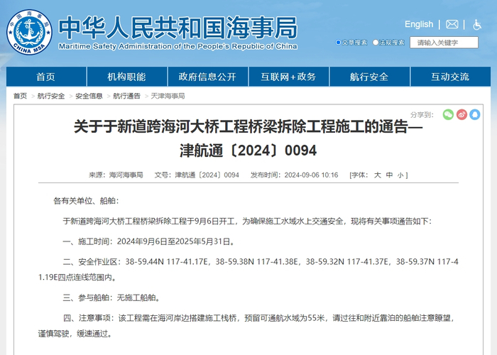 关于于新道跨海河大桥工程桥梁拆除工程施工的通告—津航通〔2024〕0094