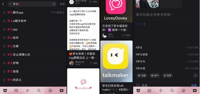 但继续往下浏览,笔者注意到有一款眼生的产品不断出现,伴随着"我沉溺一生且无法戒掉的梦女软件"、"终于找到最贴我担的AI"、"梦女狂喜"等颇具噱头的标题,吸引着笔者点了进去。