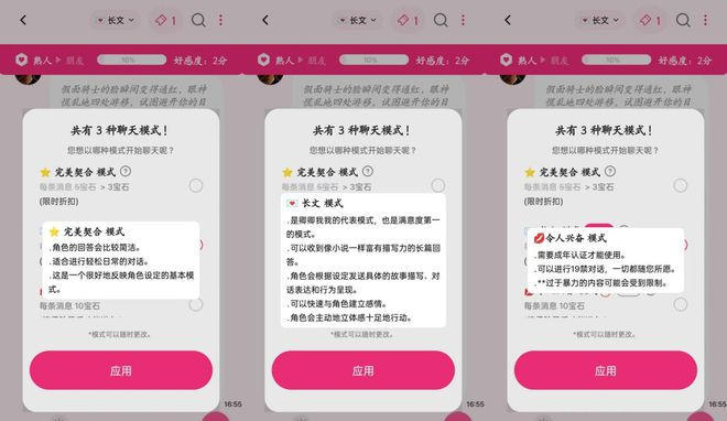 第三种"令人兴奋 模式"是19禁模式,成年认证是硬性条件,其次需要到达情侣阶段才能使用,过于暴力的内容会受到限制,每条消息需花费10宝石。