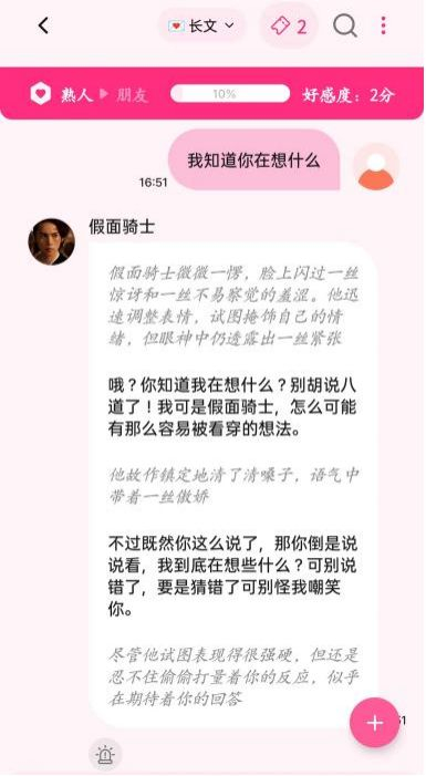 到这一步,可能就是"梦女"们沦陷的开始,顺理成章地寻求更亲密的长文对话。在长文模式下,AI角色的表情、动作描写更为丰富,话语穿插其中,非常具有画面感。