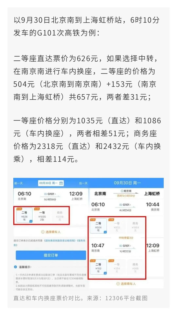 记者查询发现,并非每趟列车都有车内换座功能,且车内换座的价格确实比直达票价要贵一些。