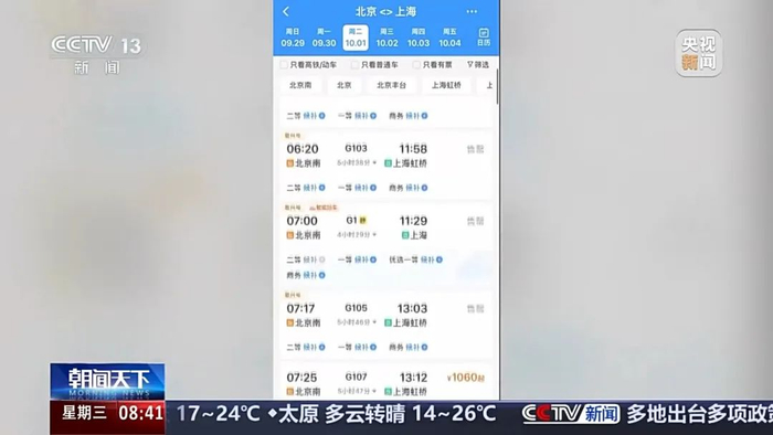 铁路12306科创中心技术负责人杨立鹏:9月29日至10月1日节前出行高峰时段,北京至天津往返、苏州至上海、南京至上海、深圳至香港往返、保定至北京、南宁至广州、上海至苏州等方向的部分车次仍有余票;10月6日至7日节后返程高峰时段,上海至南京往返、深圳至香港往返、广州至南宁、北京至上海、上海至苏州、成都至重庆等方向的部分车次仍有余票。