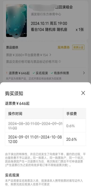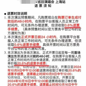 以“张某某巡回演唱会”为例,上海的官方销售渠道退票手续费有0.6%和20.6%两档。