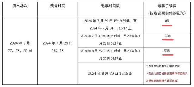 摩天轮(第三方票务渠道)的退票规则为,平台预售时间开始的48小时内购买并退票的收取0.6%退票手续费,平台预售时间开始的48小时后至售票通道关闭前3日收取20.6%手续费,售票通道关闭前3日起停止退票。