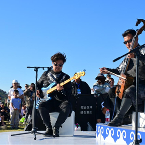 “我要用歌声来歌颂我们美丽的草原,还有奔驰的马儿和我们的亲人。”贝斯手宝路熟练地拨动琴弦,音乐响起,现场观众牵手起舞,跟随音乐节拍互动,仿佛置身于万马奔腾的大草原,这欢快的节奏从马头琴表演区越传越远。内蒙古SongS乐队——5位能歌善舞的乌兰牧骑演员,分别手持马头琴,抱着三弦和吉他,架起羊皮鼓,把传统民族音乐和摇滚乐相融合。