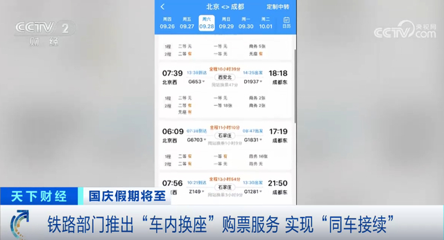 记者登录12306网站,查询9月28日从北京到成都的火车票,点击“中转”标签,系统提供了不同车次的换乘方案,其中有同站换乘、同城换乘,还新增了一种“车内换座”。这种新的售票方式,是将能组合的同一列车不同区段的两段同席别或不同席别的剩余车票,组合形成该车次的同车接续方案,供旅客选择。