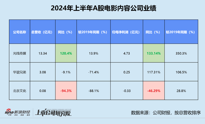 2024年上半年,以电影内容制作为主业的光线传媒、华谊兄弟和北京文化3家公司总营收约为16.50亿元,虽然同比增长52.8%,但只恢复至2019年上半年约71.3%;归母净利润明显改善,共录得4.65亿元,分别为2023和2019年同期的3.03倍、5.08倍。
