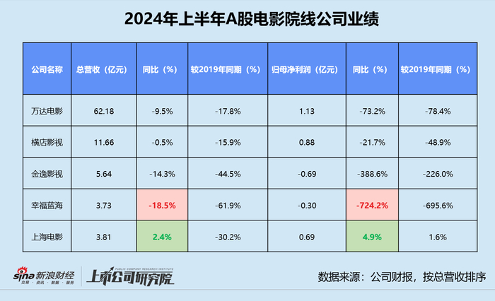 据中报数据显示,2024年上半年以院线运营为主业的万达电影、横店影视、金逸影视、幸福蓝海和上海电影5家公司总营收约为87.01亿元,同比减少8.27亿元,与2019年上半年相比下降超24个百分点;归母净利润共约1.72亿元,较2023年同期显著缩水72.7%,比疫情前的8.25亿元规模更是相去甚远。