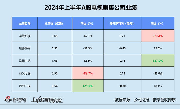 2024年上半年,以剧集制作为主业的华策影视、唐德影视、欢瑞世纪、慈文传媒和百纳千成5家公司总营收约8.35亿元,同比缩水55.5%;归母净利润共计2652.03万元,而2023年同期为2.10亿元。