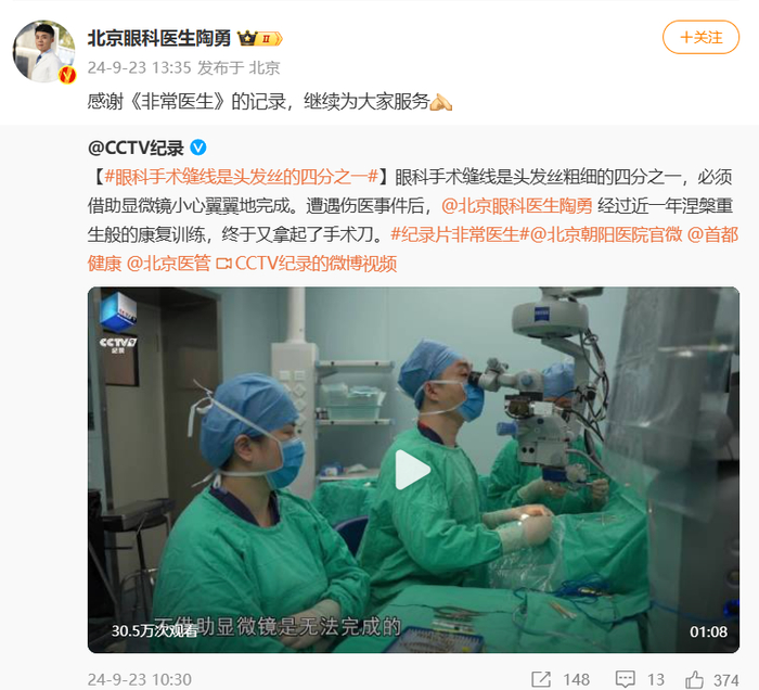 此外,陶勇在微博中表示,“感谢《非常医生》的记录,继续为大家服务。”