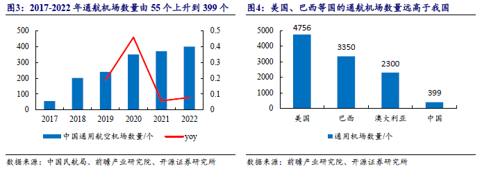 通用航空是低空经济的重要组成部分,得益于《关于促进通用航空业发展的指导意见》等政策推动,我国2017年后通航机场数量快速上升,2022年已达到399个;但对比全球范围,美国、巴西、澳大利亚等国的通航机场数量达到数千个、远高于我国,我国通航产业发展潜力仍十分广阔。