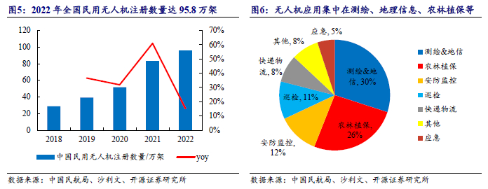 无人机产业是低空经济的主导产业,近年来我国民用无人机注册数量快速增长,应用集中在测绘、地理信息、农林植保等。2022年全国民用无人机注册数量达95.8万架,较2018年的28.7万架增长较快。无人机的下游应用领域包括测绘、地理信息、农业、安防、巡检、物流、应急等,其中测绘与地理信息在应用占比达30%,农林植保占比26%,是当前主要场景;未来随着技术进一步成熟,预计无人机在巡检、安防、快递物流、载客等领域将持续渗透。