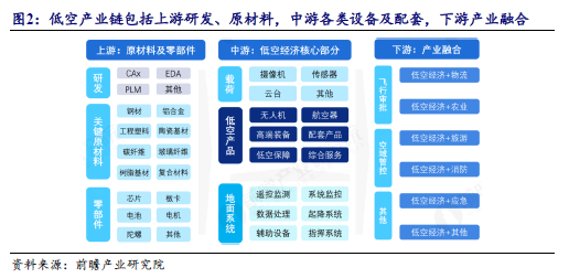 产业链来看,低空经济上游为原材料与核心零部件领域,研发包括各种工业软件,原材料包括钢材、铝合金、高分子材料等,零部件包括芯片、电池、电机等;产业链中游包含无人机、航空器、高端装备、配套产品、低空保障与综合服务;衔接下游需经过飞行审批、空域备案等,下游应用是低空经济与各种产业的融合。