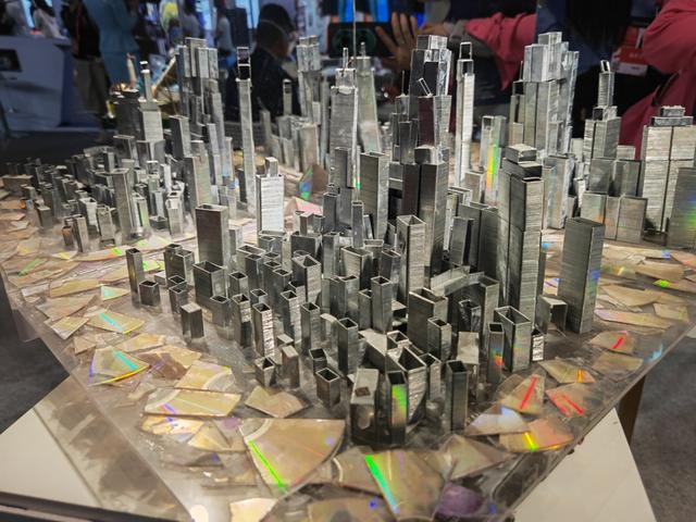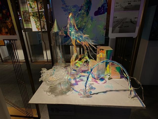 《水晶城市》通过镭射纸展现了色彩缤纷的世界,用塑料瓶制作的凤凰象征着科技孵化吉祥,透明条上的二进制代码象征着科技。用订书钉搭建而成的《城》,展现了一个以芯片技术为核心的智能化城市,融合了智能城市、低碳城市等科技概念,展现了一个脑洞大开的想象世界。