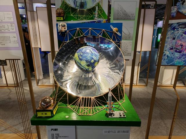 七年级学生张婉奕的作品《天眼》同样也是在静安青少年活动中心老师辅导下完成的,它模仿“中国天眼”FAST做出了模型,中间区域的光纤不断闪烁,演示着信息二进制的基本信息流。