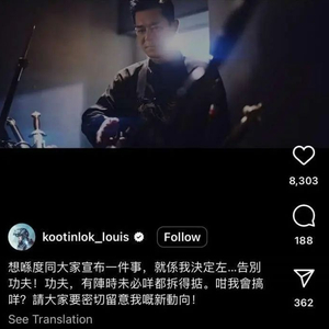 古天乐入行超过30年,拍过120多部电影,为电影圈贡献良多。近日,他在社交媒体发布了一段视频并附文:“我决定了,告别功夫。”大批影迷纷纷留言挽留。