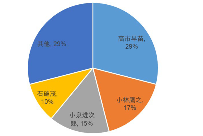 日经QUICK于9月9日发布的9月股票月度调查显示[12]“围绕事实上决定下任日本首相的自民党总裁选举,当向股市相关人士询问心中期待的新自民党总裁人选时,回答高市早苗的人占29%,位居第一;小林鹰之以17%的支持率位居第二,小泉进次郎以15%的支持率位居第三(图表2)”。