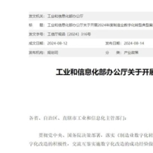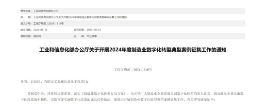 日前,为贯彻党中央、国务院决策部署,落实《制造业数字化转型行动方案》,引导广大制造业企业深刻认识数字化转型的重大意义,调动激发企业实施数字化改造的积极性,工业和信息化部发布《关于开展2024年度制造业数字化转型典型案例征集工作的通知》。