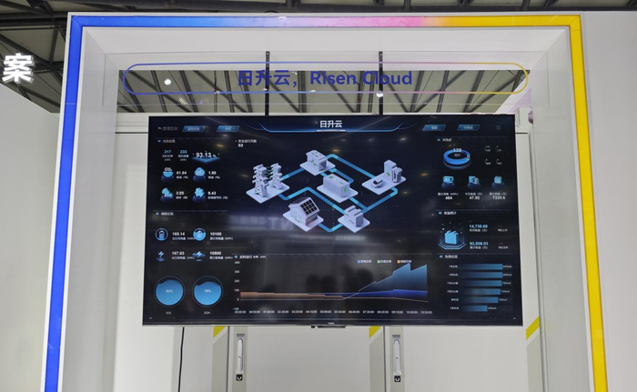 东方日升携大型储能系统解决方案、光储充解决方案以及Risen Cloud能源管理系统等前沿产品与解决方案亮相。其中eTron液冷集装箱是公司在大型储能系统领域的“王牌产品”,20尺集装箱可实现5MWh容量。同时展示的能源管理系统Risen Cloud引入了GPT技术,通过能源大模型,分析电站数据和用户习惯,持续优化电站的运行。
